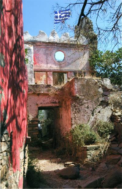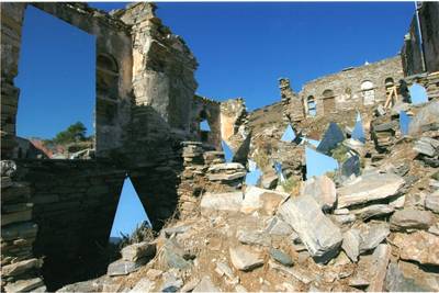 Και έπειτα η αποκάλυψη: η πανοραμική θέαση του χωριού από τον περίβολο του μοναδικού αναστηλωμένου κτιρίου των Μοναστηριών: της καθολικής εκκλησίας του Αγίου Ιωσήφ, που αν και φρεσκαρισμένη και κατάλευκη, σε απόλυτη αντίθεση με τα καφέ γκρίζα χαλάσματα των σπιτιών, μάλλον με παραφωνία έμοιαζε στο όλο σκηνικό παρά έκλεβε την παράσταση.